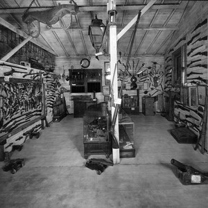Portion of Pony Express Museum devoted to arms of many types. On left in display on the wall are pistols and rifles, on the back wall are swords and sabres. Additional rifles are on wall on the right. There are small canons on the floor in foreground.