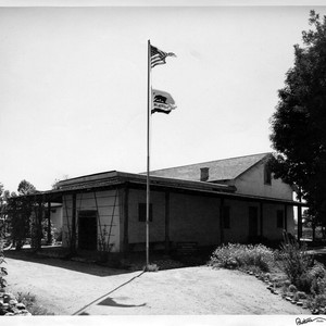 Pio Pico Ranch with United States Flag and California Flag on a flag pole. Sign in front of home reads "La Casa Del Gobernador Pio Pico, the last governor of California under Mexican Rules, 1845-46."