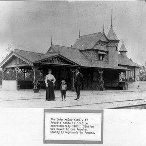 View of SW side of Arcadia Santa Fe Station. Baggage and storage portion is at the right in this photo. The John McCoy family is standing directly under the ARCADIA sign. On left is E.B. (Mrs.) McCoy, next is small son George, and next is John McCoy.