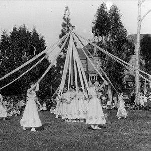 Celebrating May Day at Whittier College. A group of women are going around a May Pole.
