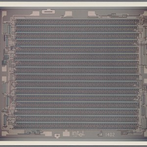 Enlarged color photograph of the Intel® 1402 Serial Memory Die. Shift register, 1K serial memory.