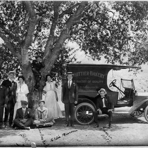 Image depcits a Whittier Bakery truck and various persons standing around the truck. Names are written in ink on the photograph. The readable names are John Macorie (in tree), Eddie Macorie (standing by truck), Ruby Montgomery (girl on right), Jimmie Wolfe (sitting on truck).