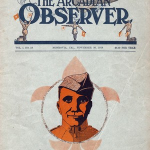 Front cover of The Arcadian Observer, official paper of the United States Army Balloon School, Arcadia, California. Vol. 1, No. 18, November 30, 1918. Artwork by Private Robert Sparks.