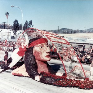 The First Americans, Arcadia's float entry in the 1975 Pasadena Tournament of Roses Parade. A bust of an unnamed American Indian dominates this tribute. Surrounding the sculpture is a copy of an Indian belt. The Indian head was the largest facial sculpture in Rose Parade history at that time.