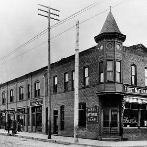 The First National Bank on Greenleaf and Philadelphia in Whittier about 1907 (104 E. Philadelphia). The Whittier Savings Bank and C.W. Clayton Real Estate offices are also visable. The C.W. Clayton Real Estate office was located at 105 E. Philadelphia.