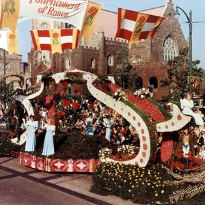 Arcadia Salutes Australia's Waratah's Festival, Arcadia's float entry in the 1970 Pasadena Tournament of Roses Parade, features an abstract free-form reminiscent of an English coach. At the forefront is a royal blue peacock. To the rear are kangaroos, koala bears and lyre birds. Miss Arcadia and her court wear light blue gowns with furry collars.
