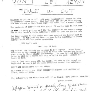 Flyer reporting the arrival of police, snipers, bulldozers taking over the park. Originally, a mass meeting was scheduled at UC-Berkeley's Sproul Plaza to support Israel. This quickly became a rally to save People's Park. Richard York spoke, "The spirit which built People's Park is stronger than gas and clubs. It is even stronger than universities. As followers of Jesus, we are committed to stand with that spirit, the sprit of the poor and alienated trying to create a new world on vacant lots of the old." Michael Lerner let Dan Siegel, president-elect of the student body, go next. Siegel told the crowd to go down and take back the park. The confrontation led to law enforcement personnel from outside of Berkeley firing buckshot into the crowd injuring over a hundred and killing one.