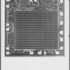 Enlarged black-and-white photograph of the Intel® 1101 RAM Memory Die. Concept: Ted Hoff. Design: Joel Karp. Project management: Les Vadasz. First RAM; developed to replace the core memory; among the competing MOS-, bipolar- and multiple-chip-systems in the end only the MOS process on silicon-gate-basis was successful; the first 1101 devices were manufactured in a former Union Carbide factory in Mountain View; later (in the end of 1971) the production moved to Santa Clara.