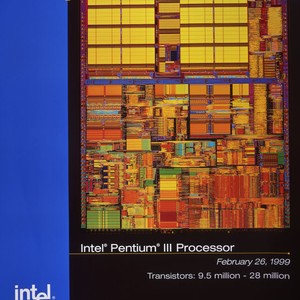 Promotional poster showing microphotograph of Intel's Pentium III processor.
