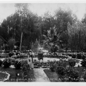 Fountain Lucky Baldwin's Ranch Santa Anita, Cal. Looking east toward Boat House and two ladies standing by fountain at Baldwin's Ranch. There appear to be lilies in pond and calla lilies planted along walk. Ladies have not been identified.