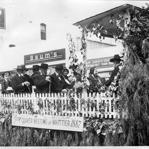 Image depicts the 60th Anniversary of Whittier's Founding. The Founder's Day float shown is a reinactment of the first Quacker meeting in Whittier in 1887.