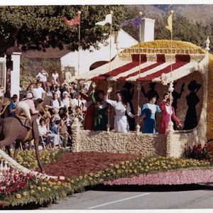 Riding in the Pasadena Tournament of Roses Parade on a float called "A Day at the Fair," is the 1969 Arcadia Rose Court (not in order): Queen Cindy Clark, Princesses Jacquie Wicken, Debbie Lewis, Cindy Harms, and Janis Thompson