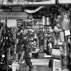 Indian figure, horse figure with bridle, mounted deer head at Pony Express Museum. Sign hanging off bull's horns reads WELLS, FARGO & CO'S EXPRESS RUTHERFORD.