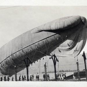 U.S. Army Balloon School at Ross Field in Arcadia, California. One balloon in sky (extreme left) and one balloon on ground with approximately 23 men making it secure. High wire fence in foreground. San Gabriel Mountains form background.