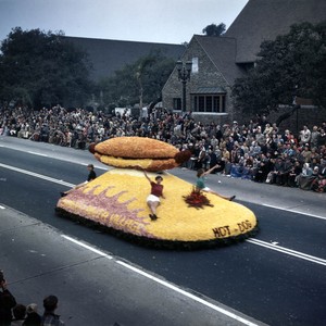 Hot dog and bun, the Santa Anita Village float entry in the 1950 Pasadena Tournament of Roses Parade, featured a 12 foot hot dog. In front is a beach scene with three girls.