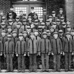 The State School (Fred C. Nelles Youth Correctional Facility) Company A. A group of men are standing in front of the Administration building.