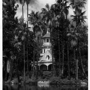 Queen Anne Cottage taken from south side of Lagoon. There are about 15 tall palm trees prominently shown at the edge of the lagoon in front of cottage. The cottage was used in the television series Fantasy Island (1978-1984).