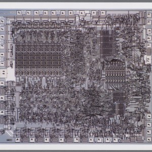 Enlarged color photograph of the Intel® 8080 microprocessor. The 8080 became the brains of the first personal computer--the Altair, allegedly named for a destination of the Starship Enterprise from the Star Trek television show. Computer hobbyists could purchase a kit for the Altair for $395. Within months, it sold tens of thousands, creating the first PC back orders in history.