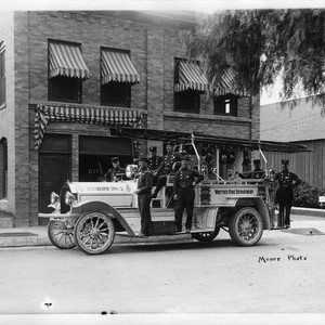 Whittier's Fire Department aboard Fire Engine No. 1 outsode pf Comstock headquarters. Photo was taken on the east side at Comstock 1/2 block S. of Philadelphia. On the back of the photo, "from James S. Muzmilo - LA County To Paul Schnedier," is written in ink.