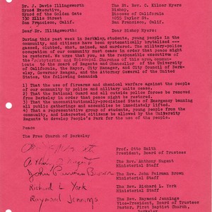 Letter from the Free Church requesting that the Local Presbyterian executive and the Episcopal bishop of California request to the City of Berkeley and the State that the National Guard and police be withdrawn and a group be set up to manage People's Park.