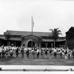 The John Greenleaf Whittier school on Whittier Ave. at Wardman St. Children are outside saluting the American flag.