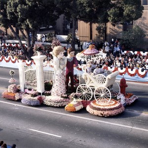 Sunday in the Park, Arcadia's float entry in the 1986 Pasadena Tournament of Roses Parade, features a Victorian family enjoying a walk in the park. The parents push a perambulator with the Arcadia Rose Court.