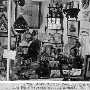 Drug store window country store in Lyon Pony Express Museum, Arcadia, California.