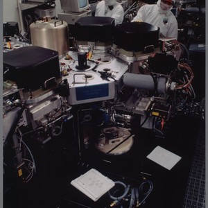 Color photograph of chemical handlers monitoring and dispensing chemicals required in the wafer fabrication (Fab) plant. Chemical dispensing is an automated process.