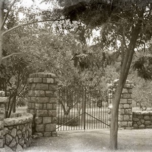 The gate and drive of Charles Bach estate in Kentfield, Marin County, California, circa 1902.