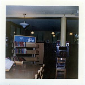 Interior photo of the Carnegie Library in Whittier. Photograph shows a book display titled "Families Worth Knowing."