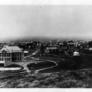 View from the hill behind Founder's Hall of Whittier College. The dirt road approaching the bridge over arroyo from the hills is College St. (now Wardman).