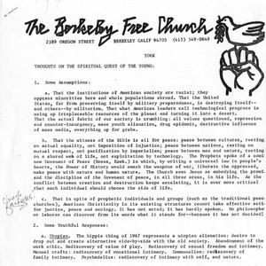 These are notes by Richard York exploring the role of youth and spirituality. For example, "Movement needs ritual and symbolism for community: Example: the Ecology Movement in Berkeley asks Free Church to write a ritual for them for the planting of a park. The Panthers ask Free Church for a ritual litany for liberation (Earth's Rebirth and Off the World Pig Litany both in our prayerbook now.)"
