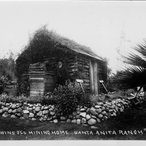 Lucky Baldwin's Old Mining Home, Santa Anita Ranch, Cal. Unidentified man standing beside a small log cabin built on the ranch.