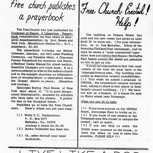 Free Church and Berkeley Switchboard Newsletter, Vol 1 (1), April 1971, announcing publication of the Covenant of Peace: A Liberation Prayerbook and that the church has just been evicted.