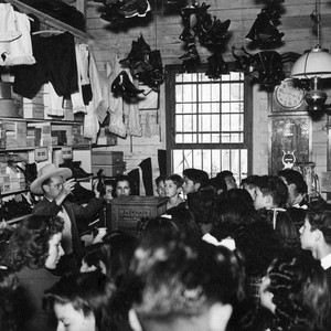 Group of students on a tour of the Pony Express Museum. Shoes, boots and undergarments hang from the ceiling.