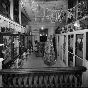 Portion of Pony Express Museum devoted largely to harness for horses, spurs, horse shoes; there is a display case on right with women's dresses. There are kerosene lamps standing on top of this case.