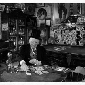 William Parker Lyon, owner of Pony Express Museum, playing cards at round table.