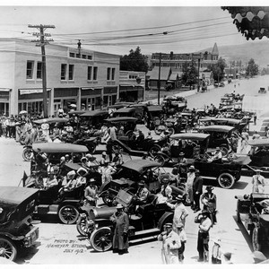 Photograph depicts a Road Rally with various automobiles and drivers. The view is looking north on Greenleaf ave. from Philadelphia. Hotel Greenleaf is visable. The Cupola building at corner of Bailey st. is also visable.
