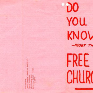 Flier with reprint of an article by Lou Harris on the Berkeley Free Church in the Voice of the Lion, the newsletter of St. Mark's Episcopal Church. The Free Church moved to the basement of 2516 Durant Avenue, just off of Telegraph Avenue, marked with a sign of a yellow submarine. Access to the sanctuary allowed the ministers to begin Saturday night services. In 1968, the Free Church faced a changing population on Telegraph. Hippies and other transients came and stayed. Political unrest edged closer to violence. Campus activists brought their issues to the street, resulting in police attacking street people. The church responded by following a building oriented model: community center, switchboard, food programs, violence intervention, rock mass and street liturgy, and liberated zone language.