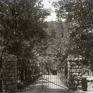 Gate and drive to Bach family estate in Kentfield, Marin County, California, circa 1902. Charles H. Bach, born in Erfurt, Germany in 1841, married Emilie Rittmeyer and moved to San Francisco (by way of Amador County) around 1874. He joined the malting business of F. Scherr, which he eventually purchased, and renamed the Charles Bach Company, Incorporated. On July 14, 1892, he bought 5.733 acres of land in Ross Valley for a down payment of $10.00 in gold coins. On this site he built his home, which the San Francisco Call referred to as a "country residence." Bach called this retreat Quisisana, named for a resort on the island of Capri where the family, which included five children, stayed in 1884; the name translates to "here you can recover." Sometime between 1896 and 1897, the family became permanent residents of Kentfield. A fire on January 19, 1901 destroyed the home, and soon after it was replaced with a late-Queen Anne-style estate designed by architect Hermann Barth of San Francisco. After Charles' death in 1904, his eldest son, Alfred, raised his own family on the estate.