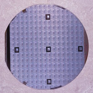 Color photograph of Intel's 8741 Peripheral Interface 4-inch silicon wafer.
