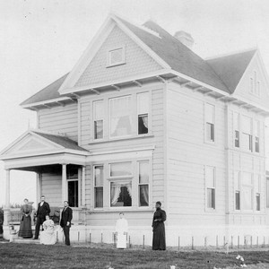 Dr. Coffin's home in Whittier on 519 Earlham. Two men, 3 ladies (one is African American), and a young boy are standing in the front of the house.