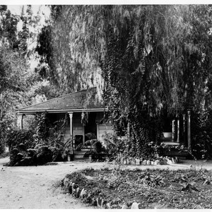 Hugo Reid Adobe as it appeared in 1903. This photo shows it to have been what appears to be wooden siding and shingle roof with wide porch as altered by E.J. (Lucky) Baldwin.