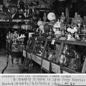 Typed caption reads "Dresden Overlay Bohemian Glass Lamps in Country Store in Pony Express Museum, Arcadia, California." Handwritten part of caption reads "Hobby No 68."