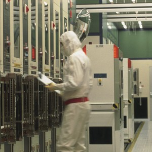Electronic industries; Intel microprocessors; Manufacturing; People; Photographs; Santa Clara (Calif.); Santa Clara County (Calif.)--History; Semiconductor wafers; Technicians; Technology