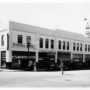 Southwest corner of Philadelphia St. at Bright Ave. The Emporium Building is shown. Businesses shown are the Whittier Secretarial School, Roger's Drug Store, Hill & Garden Clothiers, and the Whittier Grocery.