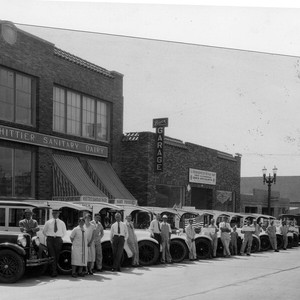 Photograph displays the Whittier Sanitary Dairy and workers and automobiles in front of the dairy. Also shown is the L.G. Rinderknect Repair Shop (Buick Specialist Garage).
