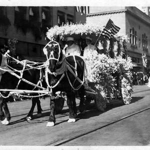 Rancho Santa Anita float entry for Rose Parade. Horse drawn wagon covered with flowers. Two people riding in front dressed in white. Part of float designed by Anita Baldwin to reflect her involvement with the Red Star Society.