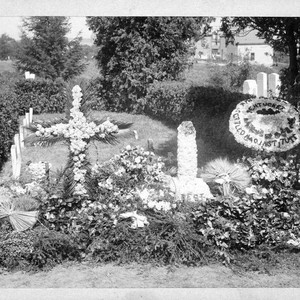 John Greenleaf Whittier's Funeral in the garden of his home in Amesbury, Massachusetts. Photograph shows funeral flowers over the gravesite.
