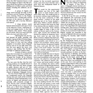 Richard York, "The Free Church in Berkeley," Church in Metropolis, No.22, Fall 1969, pp 14-17.York summarizes the activities of the church from 1967-1969. He uses the term "military-industrial-ecclesiastical complex" to describe the World Pig. This issue is described as a youth-oriented edition of the quarterly publication of the Joint Strategy and Action Committee of the American Baptist Convention, Episcopal Church, Presbyterian Church, United Church of Christ, United Methodist Church, and United Presbyterian Church.
